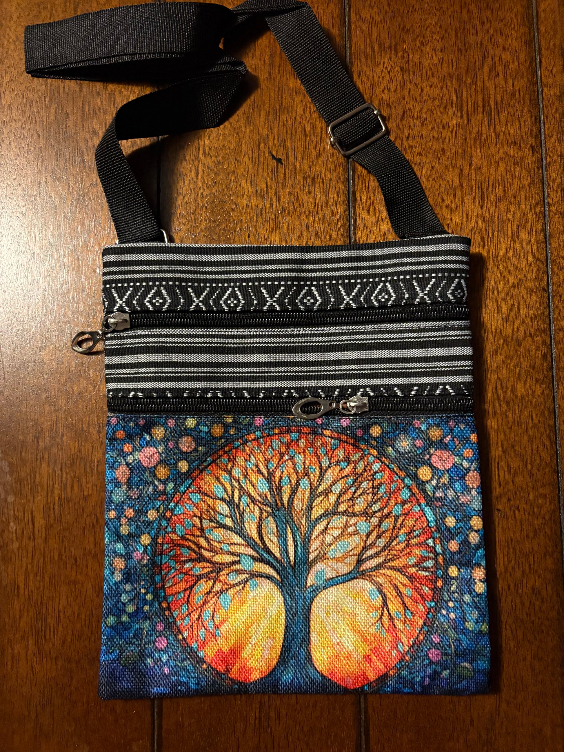 Adjustable Polyester Colorful Tree of Life Print Zippered Crossbody Bag